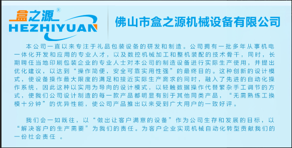 我公司專門(mén)從事紙盒生產(chǎn)設(shè)備,具有多年的印刷和包裝經(jīng)驗(yàn),據(jù)此經(jīng)驗(yàn)我們本著“無(wú)需熟練工,換模一刻鐘”的理念,研發(fā)出各種適應(yīng)廣大用戶需求的包裝行業(yè)設(shè)備。同時(shí)也能為客戶提供印刷、包裝方面的經(jīng)驗(yàn)。