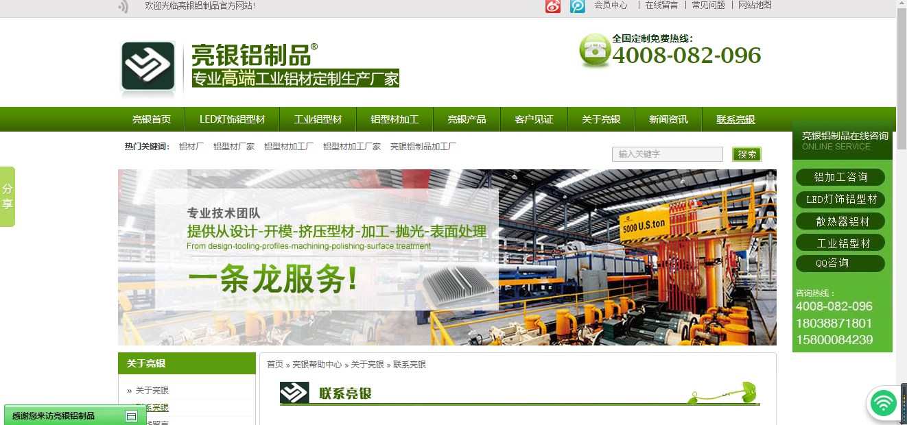 佛山市亮銀鋁制品有限公司是一家集鋁型材擠壓、深加工于一體的定制生產(chǎn)服務(wù)企業(yè)。我司于2009年成立,廠房占地面積8000多平方米,員工100人,年產(chǎn)量6000多噸,業(yè)務(wù)遍布全球范圍。本公司擁有先進(jìn)的帶雙牽引的擠壓生產(chǎn)線,500V~1370V行程立式CNC加工中心、4500-6500行程型材CNC加工中心、進(jìn)口精密數(shù)控鋸床、雙頭鋸、全自動數(shù)控滾彎機(jī)、沖床、鉆床、攻絲機(jī)等先進(jìn)機(jī)械設(shè)備。