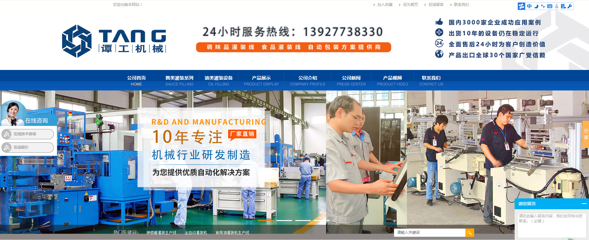 全自動(dòng)灌裝機(jī)網(wǎng)站建設(shè)案例分享: 佛山市譚工機(jī)械有限公司擁有中國專業(yè)自動(dòng)化灌裝設(shè)備制造資質(zhì)。主營業(yè)務(wù)范圍:辣椒醬灌裝生產(chǎn)線,花生油灌裝機(jī),全自動(dòng)灌裝機(jī),食用油灌裝生產(chǎn)線,濃醬灌裝機(jī),老干媽辣椒醬灌裝機(jī),醬類灌裝機(jī),潤滑油灌裝機(jī),食用油灌裝機(jī),辣椒醬灌裝機(jī)。