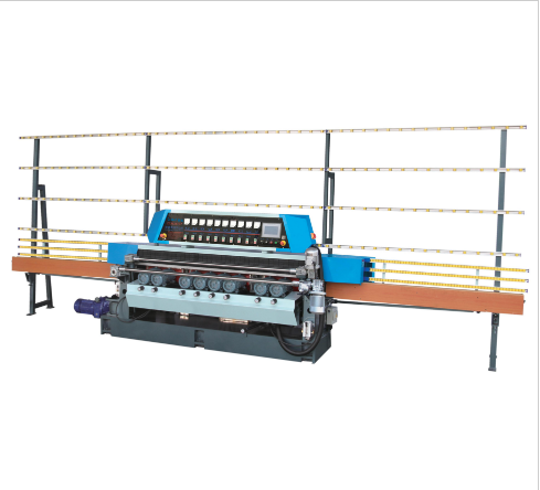 該機(jī)為九磨頭PLC控制玻璃斜邊磨邊機(jī),可一次完成粗、精磨,拋光后的效果與鏡面一致,對(duì)角度精確。控制系統(tǒng)采用PLC控制,可自動(dòng)、手換。人機(jī)界面清楚顯示玻璃厚度、斜邊寬度及角度、玻璃厚度和加工速度等各種參數(shù),傳送速度采用變頻調(diào)整。鏈板采用加厚鋼板與導(dǎo)軌鑲條經(jīng)多項(xiàng)特殊工藝制作而成,具有超強(qiáng)耐磨,不易變形,運(yùn)行平穩(wěn)等特點(diǎn)。鑄造堅(jiān)固機(jī)身,高精度、低能耗電機(jī),適用于大批量玻璃磨邊加工。