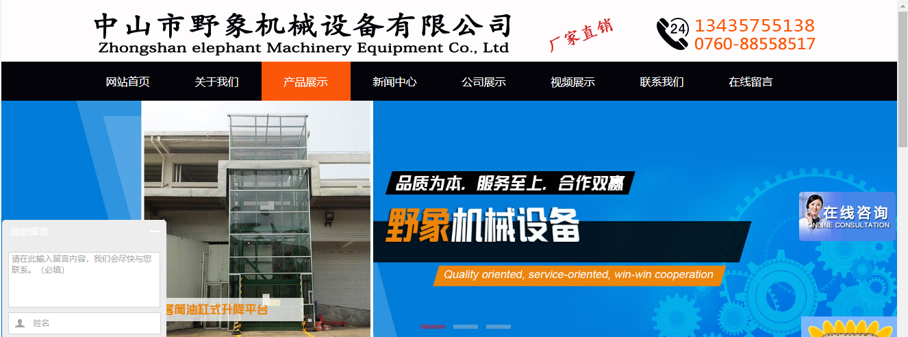 中山市野象機械設備有限公司主要產(chǎn)品是倉儲物流設備,產(chǎn)銷售后一體化管理:液壓升降平臺,升降貨梯,提升機,升降舞臺,倉儲貨架等倉儲物流搬運設備。 我們始終以“品質為本,服務至上,合作雙贏”作為我們宗旨,隨時隨地的追蹤服務。只要你訂購了我們的產(chǎn)品,無論你身處何方,我們都會及時派出專業(yè)的技術人員為你服務,你的滿意是我們的承諾。