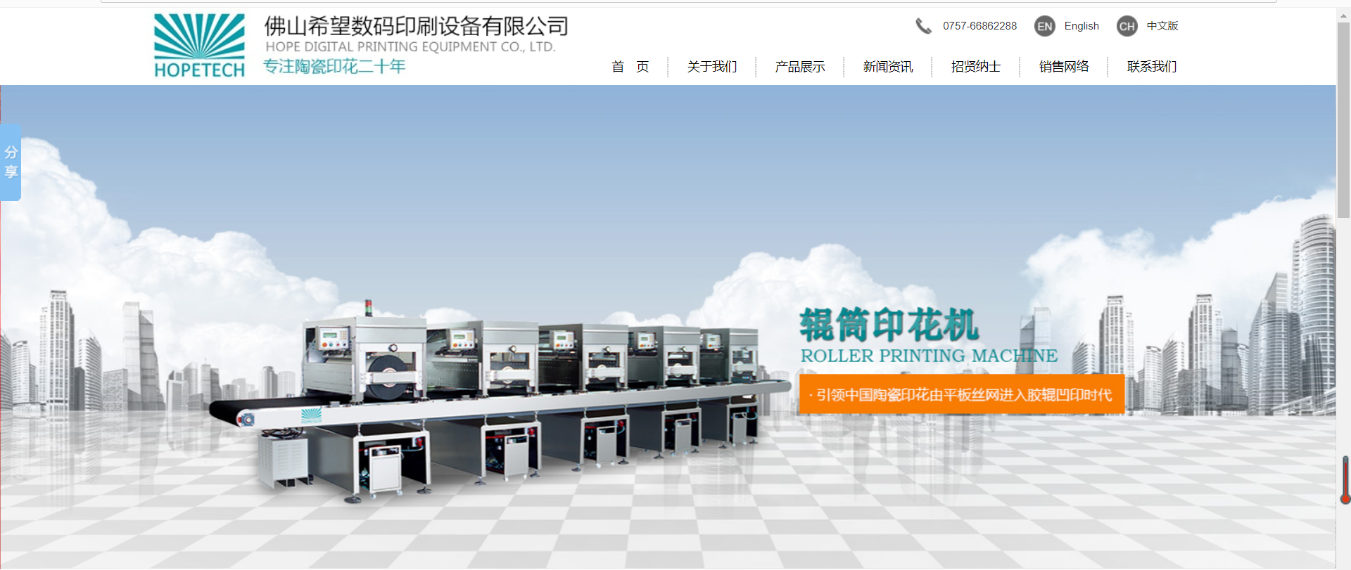 佛山希望數(shù)碼印刷設(shè)備有限公司是一家集研發(fā)、生產(chǎn)、銷售與服務(wù)為一體的高新技術(shù)企業(yè)。自1996年進(jìn)入陶瓷行業(yè),希望公司從電子產(chǎn)品軟硬件的研發(fā)起步,經(jīng)過(guò)十幾年的不懈努力及發(fā)展,現(xiàn)已成為國(guó)內(nèi)科技含量高、門類齊全、規(guī)格全面的印花和施釉設(shè)備專業(yè)制造企業(yè)。從國(guó)產(chǎn)第一臺(tái)皮帶式平板印花機(jī),精確套版印花機(jī)到中國(guó)首家研發(fā)的硅膠輥筒印花機(jī),再到第一臺(tái)顛覆傳統(tǒng)陶瓷印刷格局的國(guó)產(chǎn)數(shù)碼噴墨機(jī),希望公司以值得信賴的品質(zhì)和真誠(chéng)的服務(wù),成功奠定了其在行業(yè)內(nèi)的領(lǐng)軍地位。