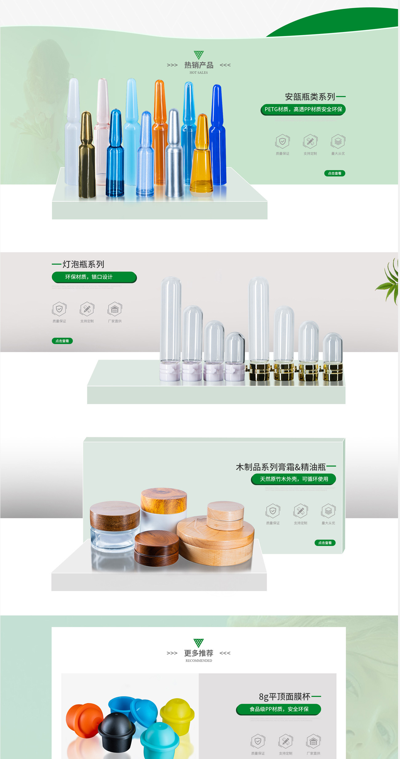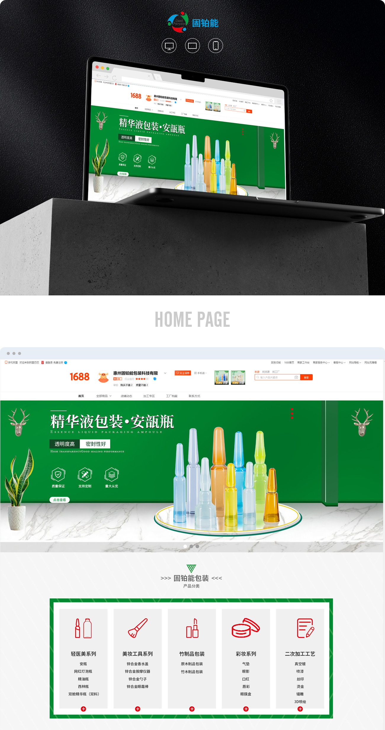 店鋪建設采用明亮、簡約的風格,色調(diào)以綠色、淺綠色為主,搭配白色和灰色,突出了清新、新穎的質(zhì)感。體現(xiàn)出固鉑能在高端化妝品包裝的研發(fā)和生產(chǎn),從而促進用戶對固鉑能的品質(zhì)信賴。