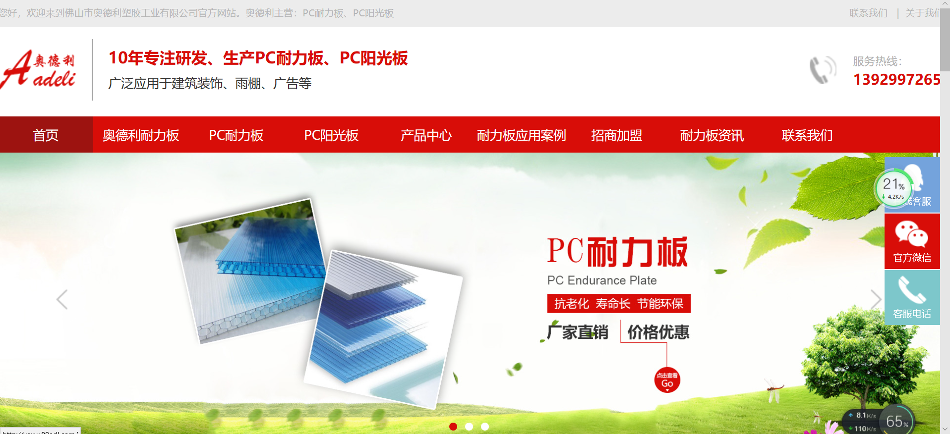 今天讓我們一起來分享一下PC陽光板網站建設案例:佛山市奧德利塑膠工業(yè)有限公司座落于——廣東省佛山市,是一家專業(yè)生產、研發(fā)、銷售于一體的高新技術企業(yè),主要生產聚碳酸酯(PC)耐力板、PC陽光板,PC耐力板它是一種綜合性能良好的工程塑料板,是目前普遍采用的一種新型高強度、透光、隔音、節(jié)能材料之一,大量用于建筑裝飾、光棚、廣告等行業(yè)。奧德利PC耐力板采用環(huán)保原料和德國的技術,根據GB/T19001-2000ibt、ISO9001-2000《質量管理體系》標準的要求建立和實施質量管理,以高素質的隊伍,良好的技術,好的生產設備,確保奧德利產品的品質。
