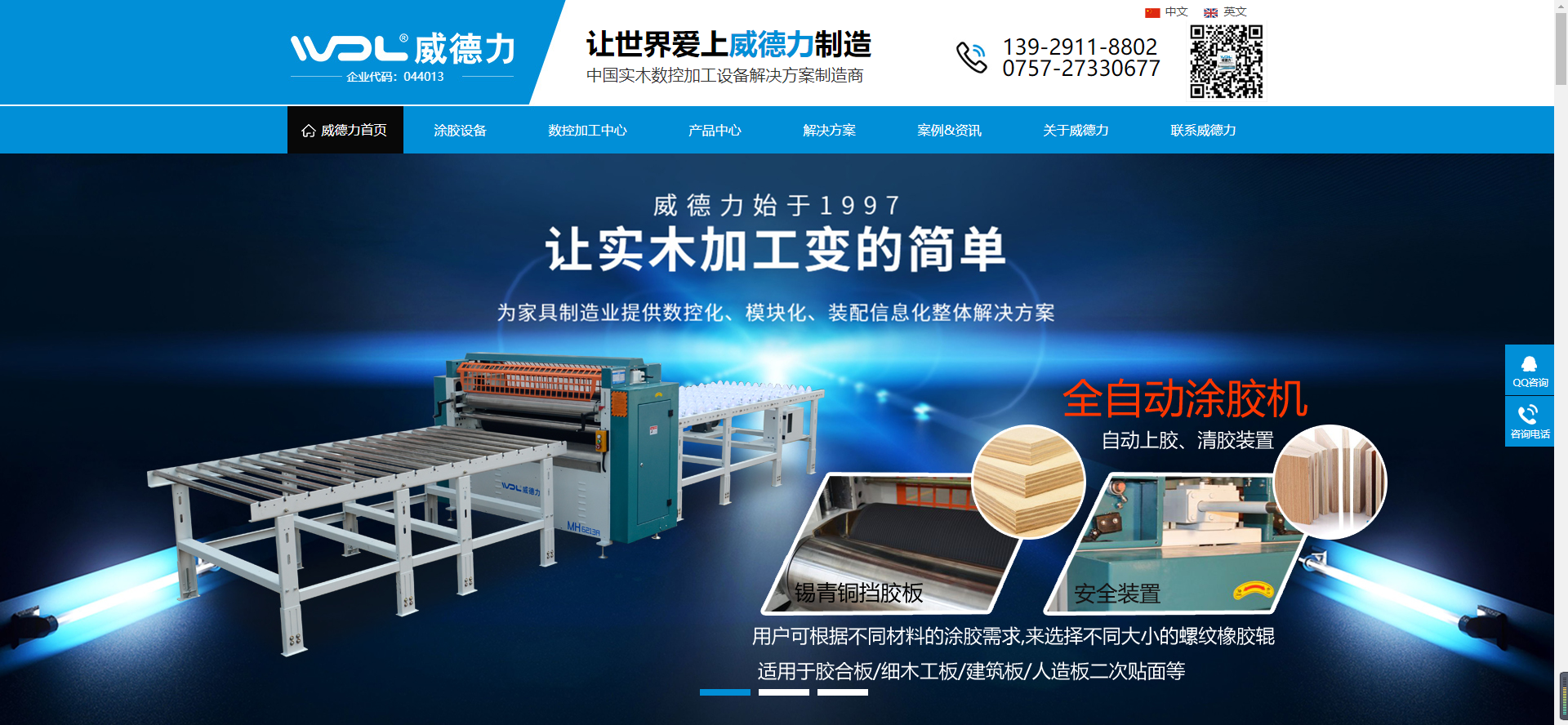 今天讓我們一起來(lái)分享一下木工壓機(jī)網(wǎng)站建設(shè)作品:廣東威德力機(jī)械實(shí)業(yè)股份有限公司位于中國(guó)木工機(jī)械重鎮(zhèn)——佛山市順德區(qū)倫教鎮(zhèn).我司經(jīng)過(guò)近 20 年的努力,目前已擁有十萬(wàn)多平方米的現(xiàn)代化生產(chǎn)廠(chǎng)房,投入成熟的數(shù)控自動(dòng)化加工設(shè)備和檢測(cè)設(shè)施,建立了一支數(shù)控系統(tǒng)應(yīng)用與機(jī)電一體化設(shè)計(jì)軟硬件開(kāi)發(fā)相結(jié)合的高素質(zhì)團(tuán)隊(duì),公司自主創(chuàng)新開(kāi)發(fā)各類(lèi)木材加工工藝的設(shè)備,包括:木工壓機(jī)(且我司是中國(guó) 3000 噸木工壓機(jī)較早與產(chǎn)銷(xiāo)規(guī)模較大的企業(yè))、數(shù)控鋸、數(shù)控銑機(jī)、數(shù)控榫槽機(jī)、數(shù)控加工中心、數(shù)控打角鉆孔攻牙機(jī)、木工銑床、木工鋸床、集成材加工設(shè)備、木工機(jī)械輔助設(shè)備、環(huán)保設(shè)備的除塵設(shè)備和噴漆保護(hù)設(shè)備,涵蓋了木材加工業(yè)鋸切、刨切、集成材銑削、拼接、拼板、砂光及家具制造業(yè)中銑、鋸、鉆加工,成型、貼面、砂光、裝配、噴漆等工序所需的機(jī)械裝備。威德力全國(guó)200多家銷(xiāo)售服務(wù)中心覆蓋了各省份的一、二級(jí)城市,輻射華北、華中、華南、西南等區(qū)域;在海外市場(chǎng)的銷(xiāo)售與推廣上,公司產(chǎn)品已遠(yuǎn)銷(xiāo)至國(guó)外 80 多個(gè)國(guó)家。近20年來(lái)兢兢業(yè)業(yè)地發(fā)展。2013年被廣東省認(rèn)定為廣東省制造企業(yè) 500 強(qiáng)。