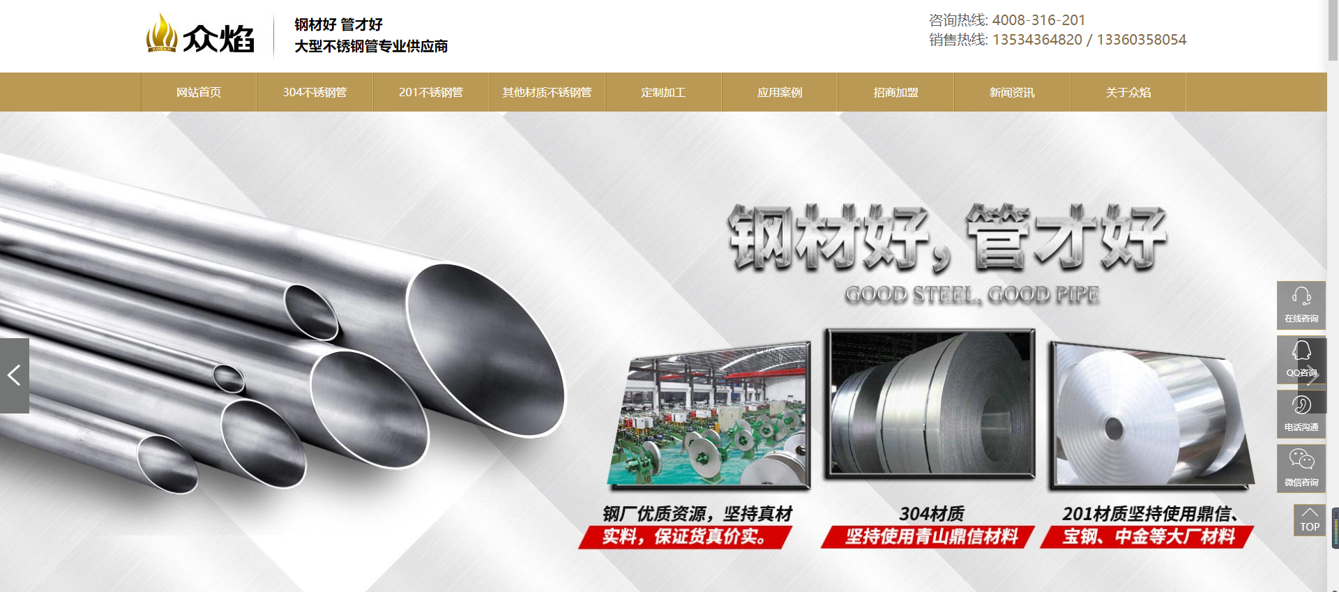 今天讓我們一起來分享一下不銹鋼原材料網(wǎng)站推廣案例:佛山眾焰不銹鋼有限公司是一家聚焦于不銹鋼管領(lǐng)域的專業(yè)公司,業(yè)務(wù)范圍涵蓋不銹鋼原材料貿(mào)易、不銹鋼管研發(fā)、不銹鋼管產(chǎn)成品的生產(chǎn)、不銹鋼管深加工及銷售,眾焰目前擁有多家不銹鋼管生產(chǎn)基地,共擁有近150條業(yè)內(nèi)先進的不銹鋼管生產(chǎn)線,產(chǎn)品系列齊全,同時擁有國內(nèi)專業(yè)的檢測設(shè)備,目前年產(chǎn)能逾6萬噸。公司總部位于不銹鋼產(chǎn)業(yè)重鎮(zhèn)廣東省佛山市。