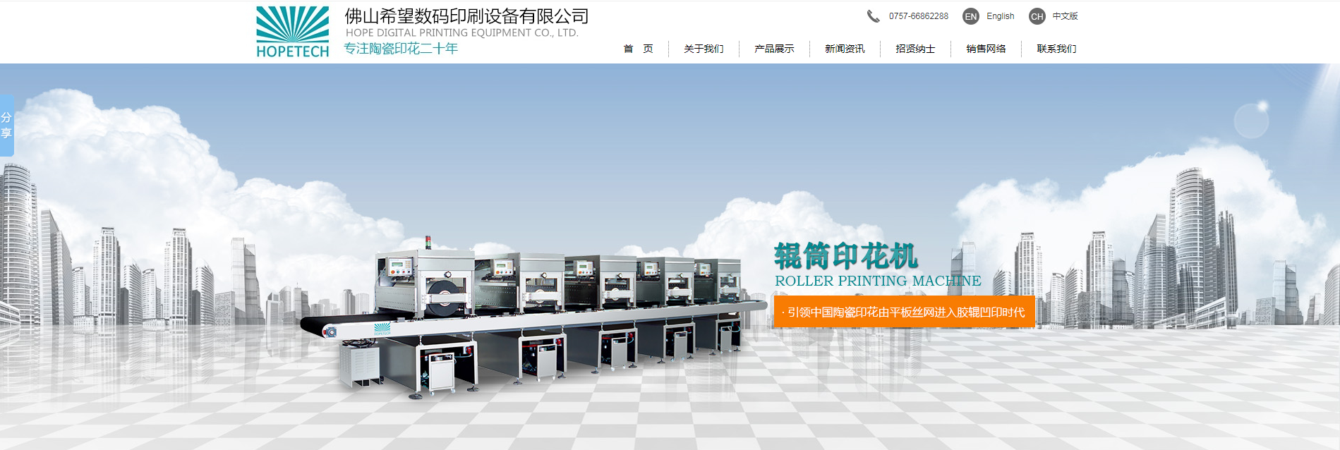 今日分享印刷設(shè)備: 佛山希望數(shù)碼印刷設(shè)備有限公司是一家集研發(fā)、生產(chǎn)、銷(xiāo)售與服務(wù)為一體的高新技術(shù)企業(yè)。自1996年進(jìn)入陶瓷行業(yè),希望公司從電子產(chǎn)品軟硬件的研發(fā)起步,經(jīng)過(guò)十幾年的不懈努力及發(fā)展,現(xiàn)已成為國(guó)內(nèi)科技含量高、門(mén)類(lèi)齊全、規(guī)格全面的印花和施釉設(shè)備專(zhuān)業(yè)制造企業(yè)。從國(guó)產(chǎn)第一臺(tái)皮帶式平板印花機(jī),精確套版印花機(jī)到中國(guó)首家研發(fā)的硅膠輥筒印花機(jī),再到第一臺(tái)顛覆傳統(tǒng)陶瓷印刷格局的國(guó)產(chǎn)數(shù)碼噴墨機(jī),希望公司以值得信賴(lài)的品質(zhì)和真誠(chéng)的服務(wù),成功奠定了其在行業(yè)內(nèi)的領(lǐng)軍地位。