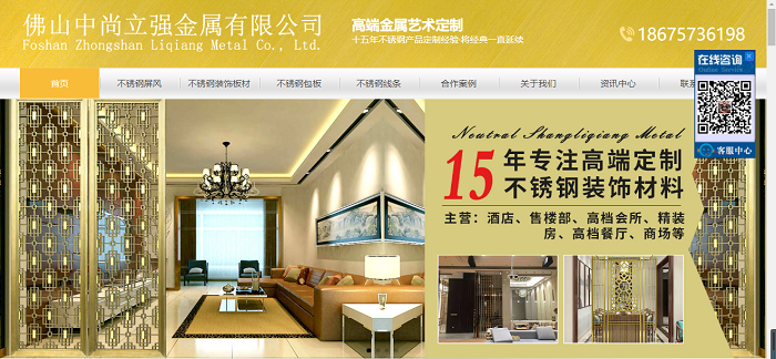 佛山中尚立強(qiáng)金屬有限公司位于佛山不銹鋼產(chǎn)業(yè)基地,及不銹鋼產(chǎn)品生產(chǎn)加工,研發(fā)銷(xiāo)售于一體。主要生產(chǎn)和銷(xiāo)售各種材質(zhì)的不銹鋼裝飾板材,承接各種不銹鋼裝飾工程提供各種安裝解決方案,定制不銹鋼制品、屏風(fēng)、酒柜,公司配套有精密剪壓刨設(shè)備、平板激光機(jī)、激光切管機(jī)、焊接打磨制品部、真空電鍍?cè)O(shè)備。